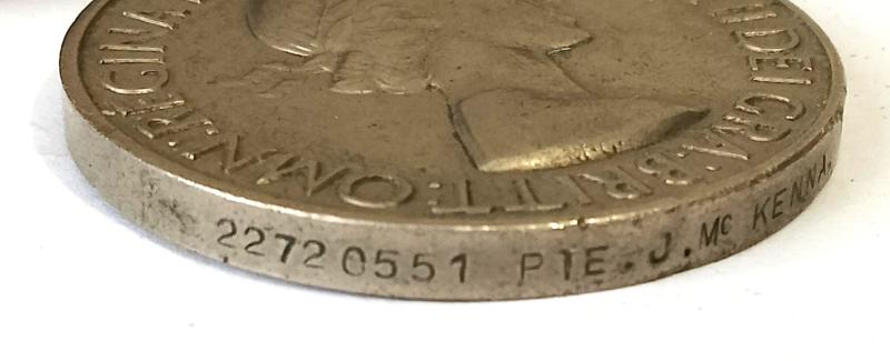 Korean Medal Pair. The Korean Medal is correctly impressed to the recipient "22720551 PTE J. McKENNA R.S" & in our opinion Grades as N.V.F The UN Medal is unmarked as issued The Korean Medal comes with a section of contemporary ribbon