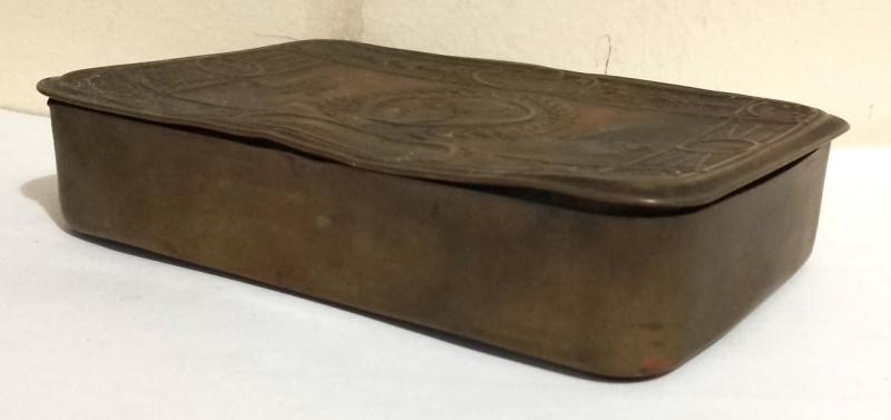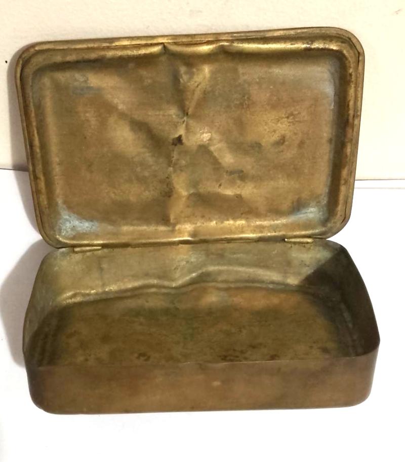 WW1 P.M Tin . The tin is body has suffered several dents etc but no edge splits with the hinges working perfectly & the lid shutting snugly