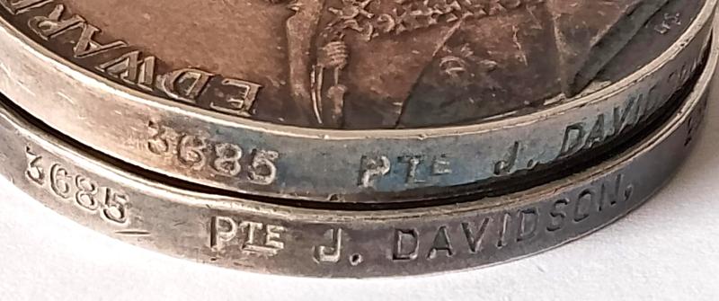 Boer War Medal Pair consisting of The Queens South african Medal with Four Clasps, "Ghost Dates" & Original Ribbon. The Kings South African Medal with Two Clasps & original Ribbon . Both medals are correctly impressed with the recipients details "3685 PTE J DAVIDSON 2nd RL HIGHRS on The QSA & "3685 PTE J DAVIDSON RL HIGHRS" on The KSA. Both medals in our opinion Grade as N.V.F
