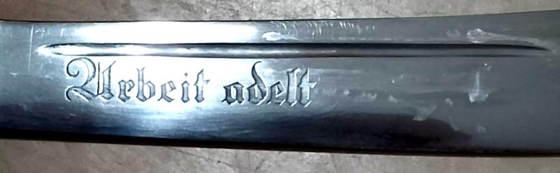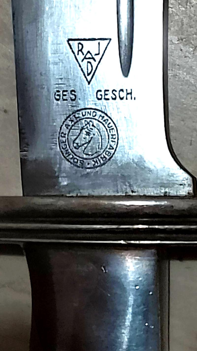 Good clean example of a R.A.D Hewer complete with unofficial hanger. The blade motto is clear with the makers logo {Solinger Axt Und Hauerfabrik GMBH} to the rear. The hilt simulated Stag grips & plating are intact. The black painted scabbard with decorative nickel mounts are complete