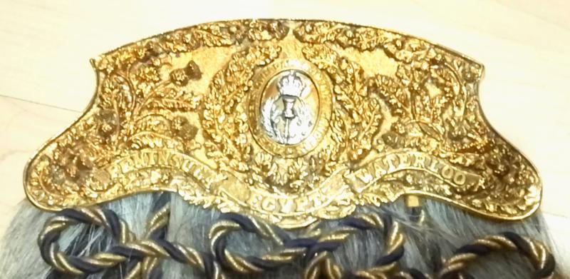 The Brass / Gilt Cantle retains a high percentage of its original finish. The upper front of the Cantle is decorated with thistle motifs in high relief with oval Regimental badge baring the Kings Crown .The lower Cantle has the Regimental Battle Honours ; Peninsula, Egypt & Waterloo. The rear of the Cantle is stamped with the makers details.
