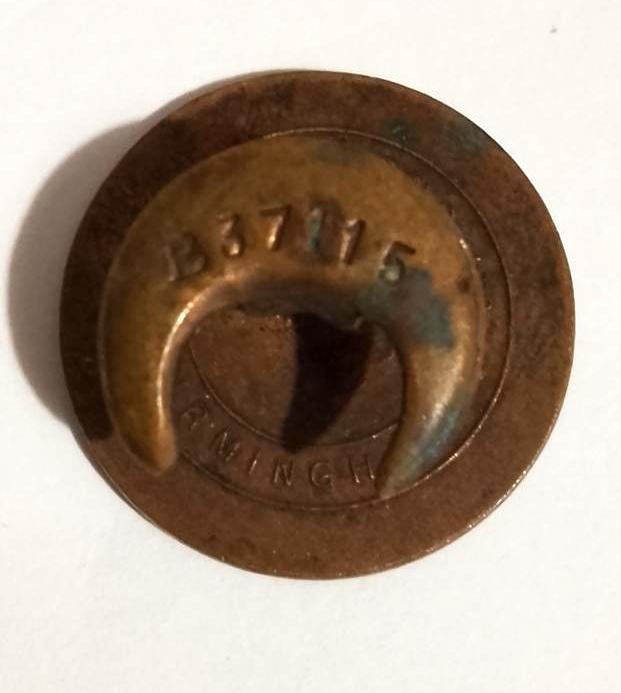 WW1 Period Circular Gilt Badge with Kings Crown surrounded "On War Service 1914" inlaid in blue enamel. Maker "Vaughtons Ltd" with the unique no B37115