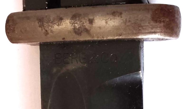 Excellent untouched example of a Matching Numbered K98 German Army Bayonet by BERG & Co. The bayonet bakelite grips are in excellent condition with the blade retaining a high percentage of its original bluing with no evidence of being sharpened The metal scabbard is complete with leather frog