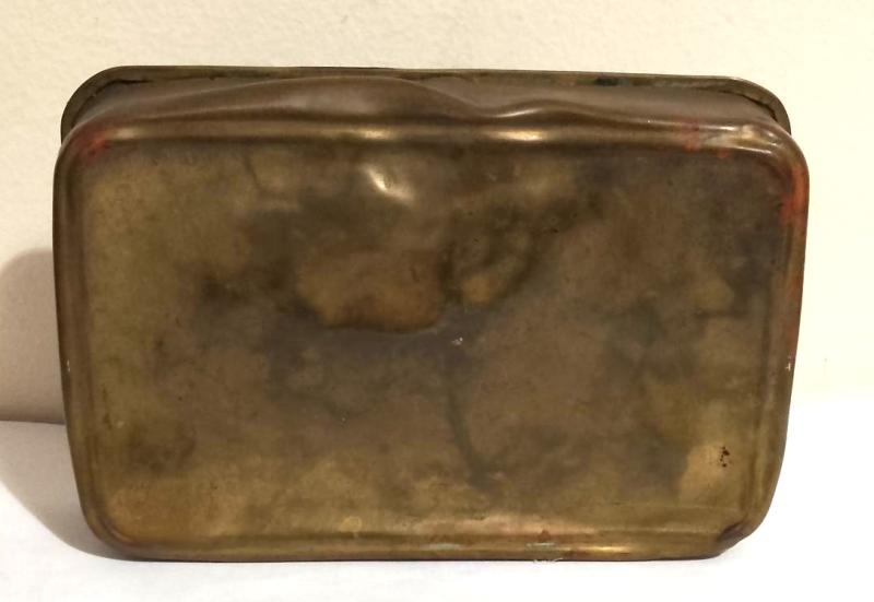 WW1 P.M Tin . The tin is body has suffered several dents etc but no edge splits with the hinges working perfectly & the lid shutting snugly