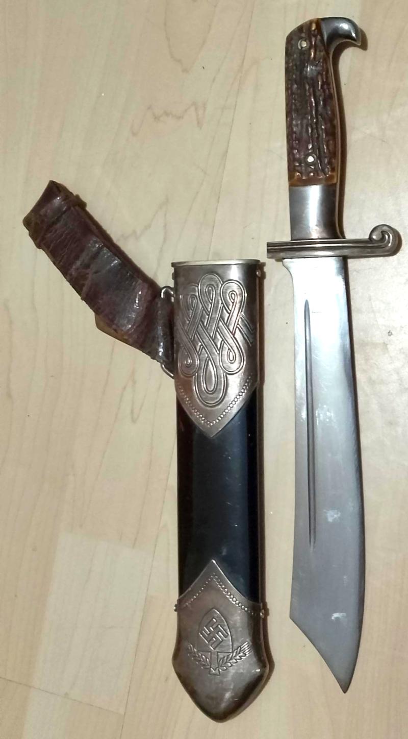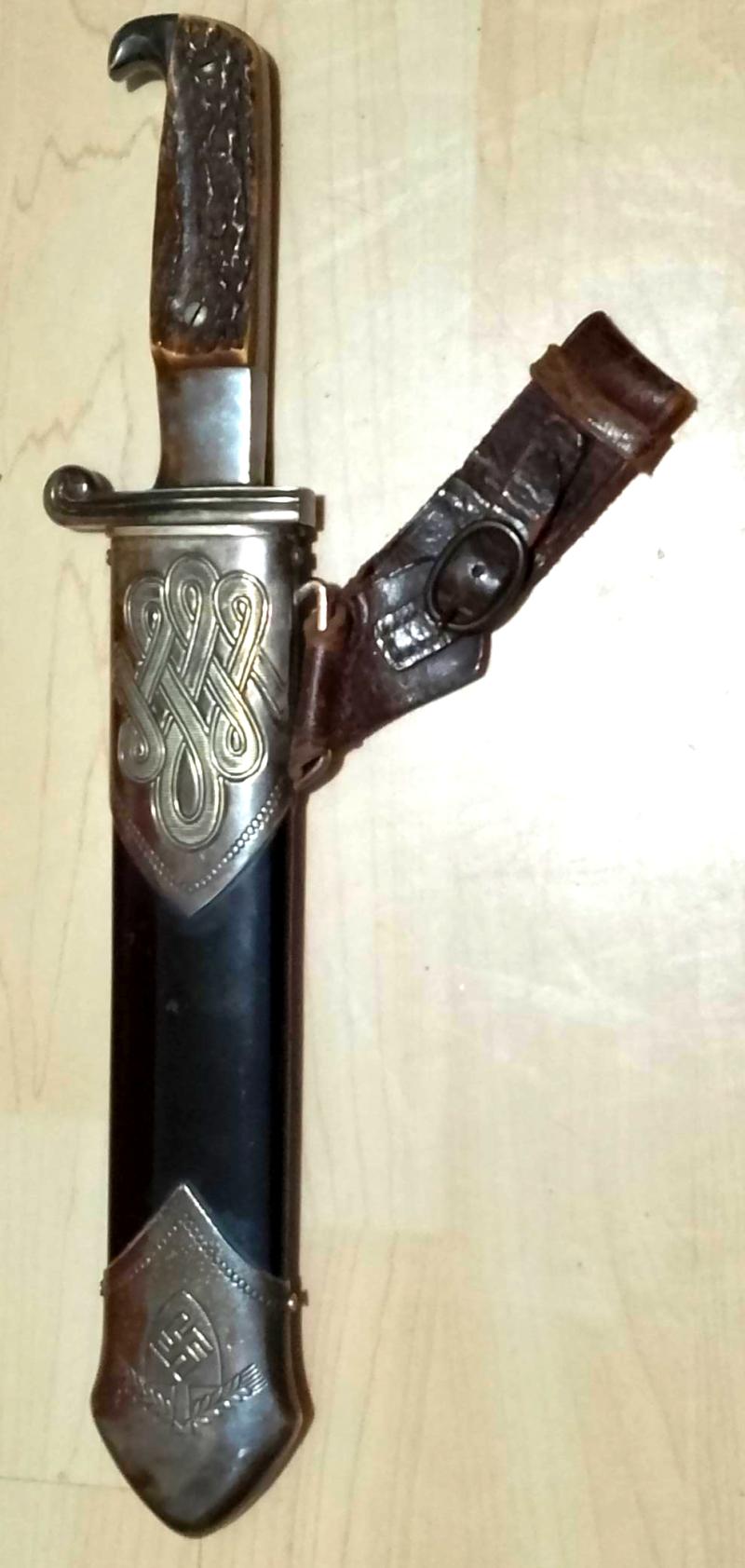 Good clean example of a R.A.D Hewer complete with unofficial hanger. The blade motto is clear with the makers logo {Solinger Axt Und Hauerfabrik GMBH} to the rear. The hilt simulated Stag grips & plating are intact. The black painted scabbard with decorative nickel mounts are complete